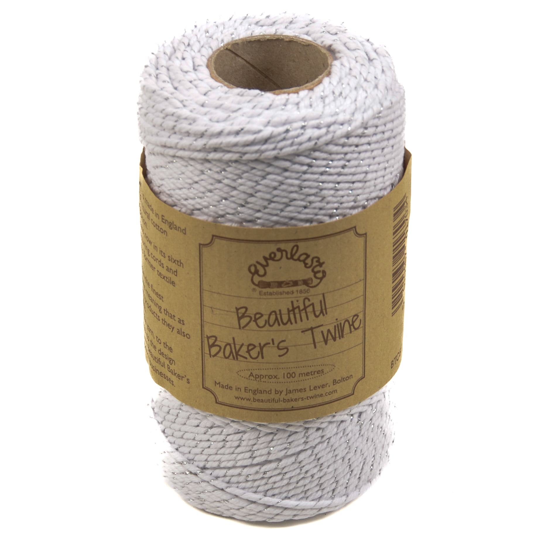 A beautiful british made premium White/silver Sparkle Baker’s Twine, made from 100% natural soft cotton and wound on a recycled cardboard spool.